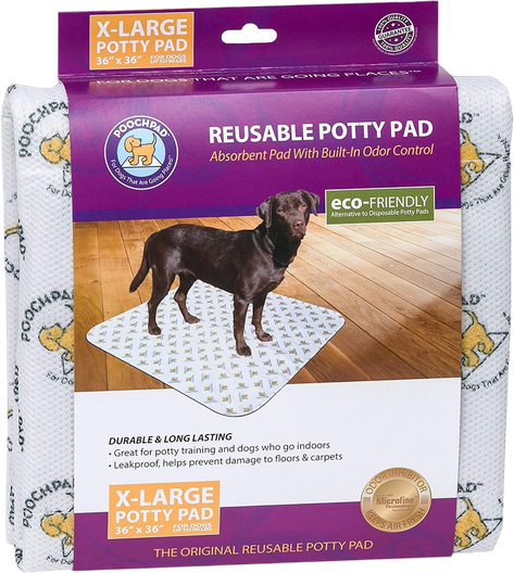 Made with Microfine fibers and odor inhibiting technology, PoochPads are absorbent, odor-controlling pads ideal for puppies, older or incontinent dogs, and dogs that are "home-alone" throughout the work day. Use on floors, beds, cages, or any accident-prone area. Quickly absorbs liquid without soaking through. Reusable and good for 300+ washes. Environmentally friendly.